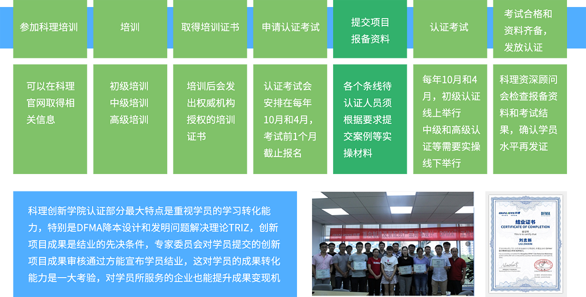 科理創(chuàng)新學(xué)院認(rèn)證部分最大特點(diǎn)是重視學(xué)員的學(xué)習(xí)轉(zhuǎn)化能力,特別是DFMA降本設(shè)計(jì)和發(fā)明問題解決理論TRIZ,創(chuàng)新項(xiàng)目成果是結(jié)業(yè)的先決條件,專家委員會對學(xué)員提交的創(chuàng)新項(xiàng)目成果審核通過方能宣布學(xué)員結(jié)業(yè),這對學(xué)員的成果轉(zhuǎn)化能力是一大考驗(yàn),對學(xué)員所服務(wù)的企業(yè)也能提升成果變現(xiàn)機(jī)會。