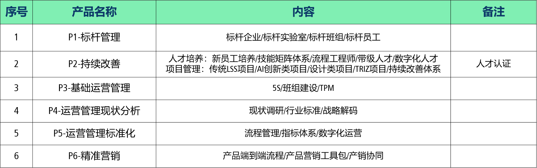 01 采用改善手段,幫助企業(yè)進行運營指標提升,通過6大產(chǎn)品解決企業(yè)運營瓶頸,快速提高企業(yè)運營指標水平。