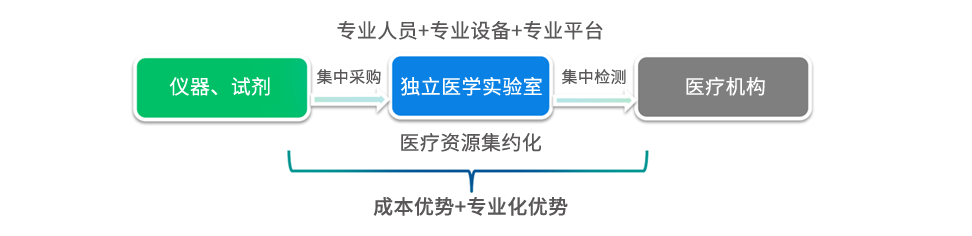 于是醫(yī)學檢驗業(yè)務成為醫(yī)療服務領域?qū)I(yè)化分工的先行者,行業(yè)分工演化為醫(yī)院專注于診療服務,獨立醫(yī)學實驗室將原本屬于醫(yī)院檢驗科、 病理科的檢驗業(yè)務外包進行集中檢驗,具有顯著的規(guī)模效應,通過規(guī)?;?jīng)營、專業(yè)化分工提升了檢驗效率及檢驗水平。