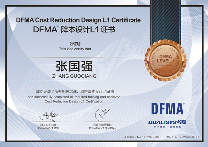 可獲得由科理咨詢、美國(guó)BDI聯(lián)合頒發(fā)的DFMA? L1證書