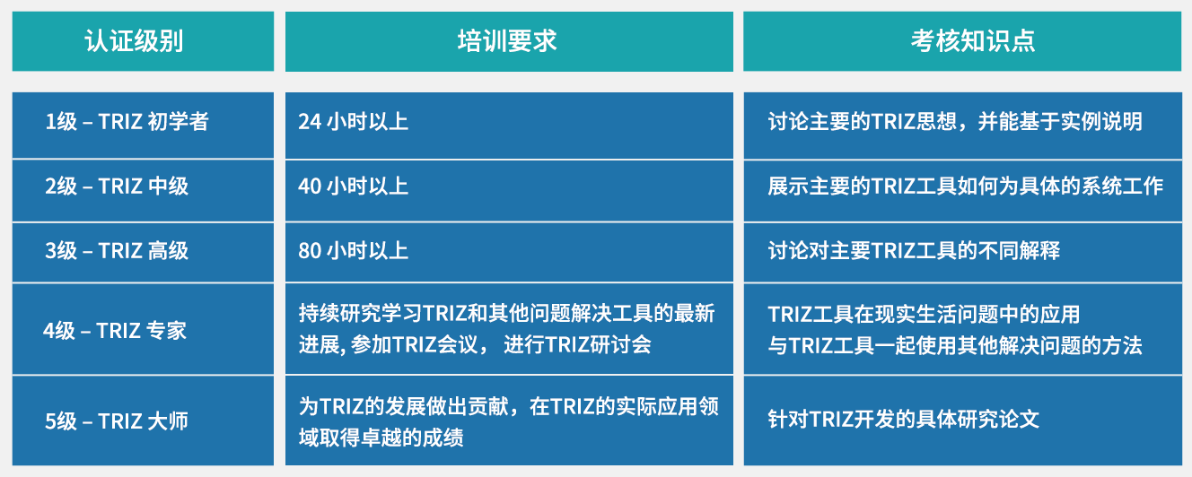 1-3級(jí)認(rèn)證主要評(píng)估申請(qǐng)者對(duì)于TRIZ理論知識(shí)的掌握和理解程度。4級(jí)和5級(jí)主要評(píng)估申請(qǐng)者在TRIZ領(lǐng)域的實(shí)際應(yīng)用能力和貢獻(xiàn)度。